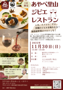 イベント情報 ◆あやべ里山ジビエレストラン2025 ★シカ、イノシシ、クマ、多種のジビエを味わえる!★綾部産野菜のマルシェも! シカ、イノシシ、クマなど野生動物が里山に与える影響、里山の現状を専門家からお話しを伺い、これからの人と野生動物と森林の関わり方を考えます。 お話 続きを読む » 2025年10月22日