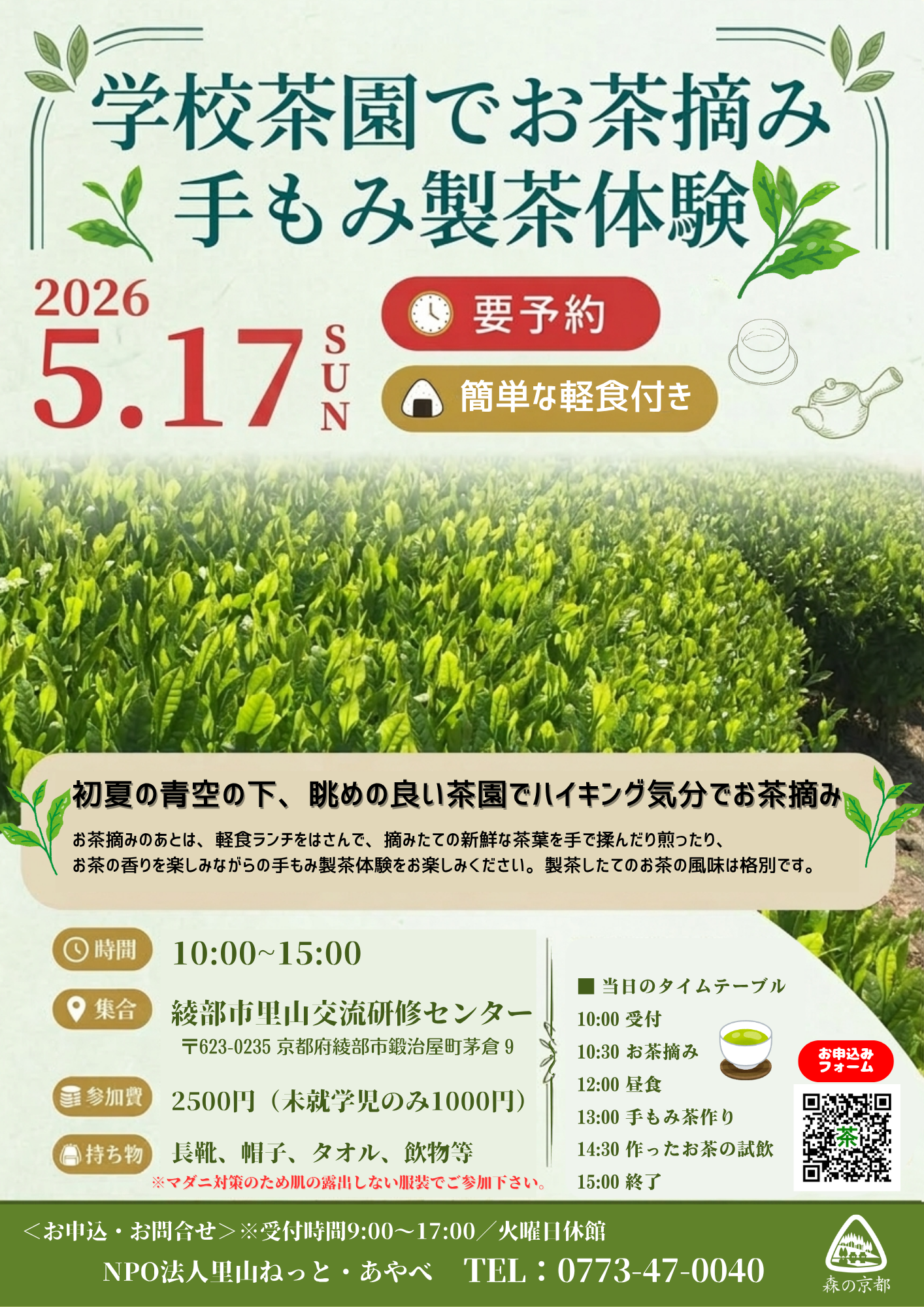 全国茶品評会でも高く評価される京都・中丹エリアの高品質なお茶。初夏の爽やかな空の下、眺めの良い茶園で、伝統的なお茶文化を五感で楽しむ特別な体験会を開催します 。