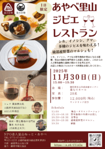 ★シカ、イノシシ、クマ、多種のジビエを味わえる!★綾部産野菜のマルシェも! このイベントでは、綾部市にあるジビエ処理施設「株式会社いのしか」のシカ、イノシシ、クマといった多彩なジビエ肉を使って、鹿肉シンタマのローストなど